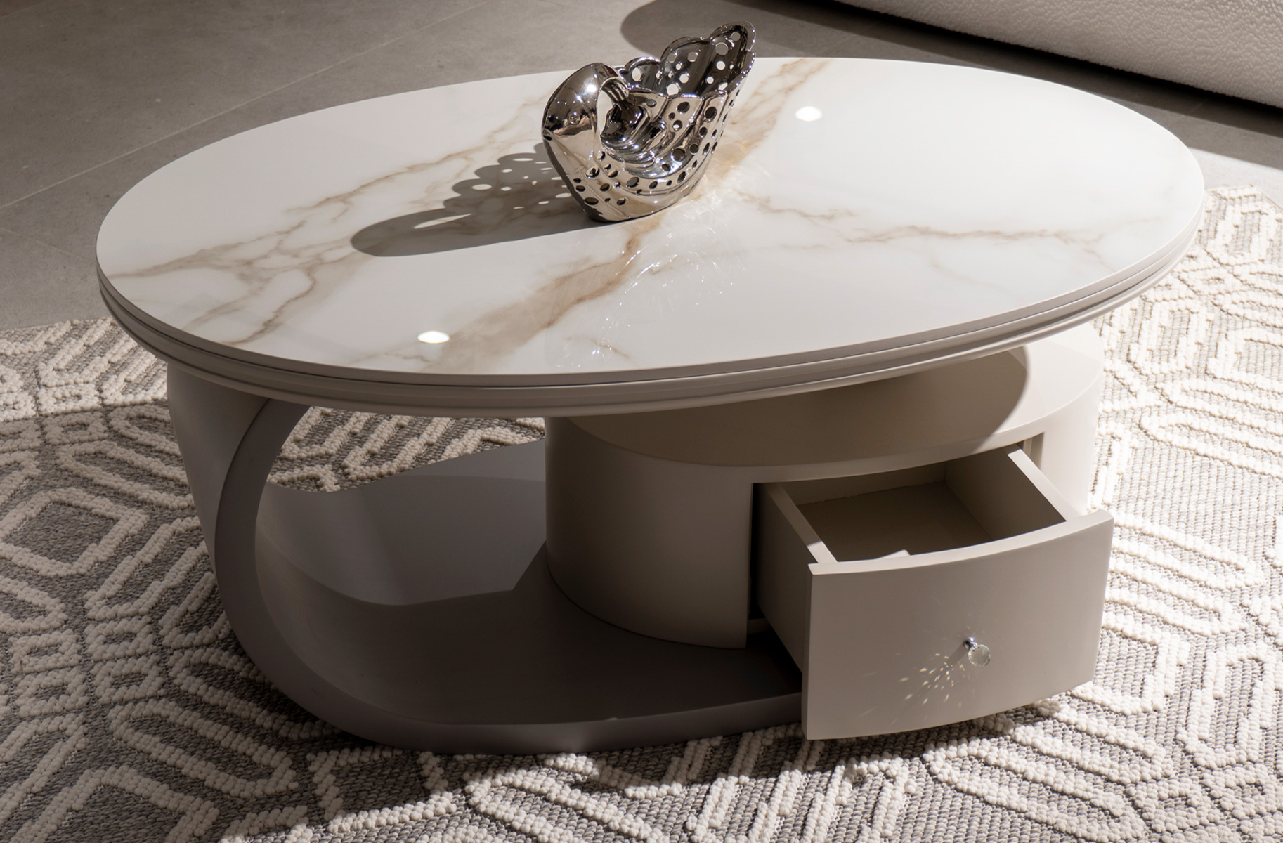 Monvela Orta Sehpa, lake malzemenin zarif duruşunu porselen üst tablayla buluşturarak modern ve şık bir görünüm sunar. Çekmece detayı ise kullanım kolaylığı sağlayarak fonksiyonelliği artırır.